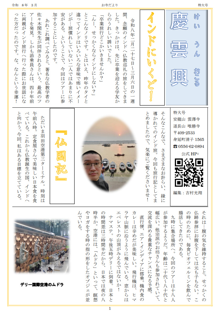 令和八年二月二十七日~三月六日の一週間、念願のインドへ仏教巡礼の旅をしてきました。きっかけは、先に卒業を迎える学友からのうれしい誘いでした。